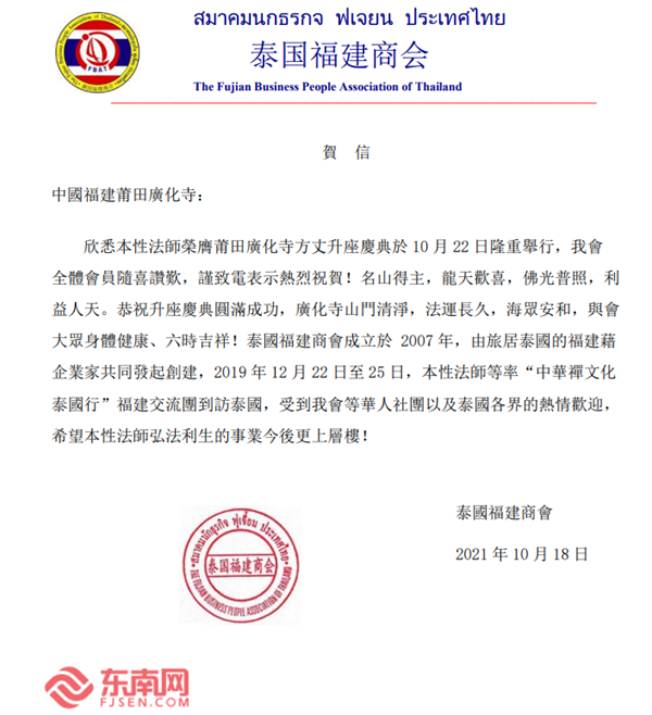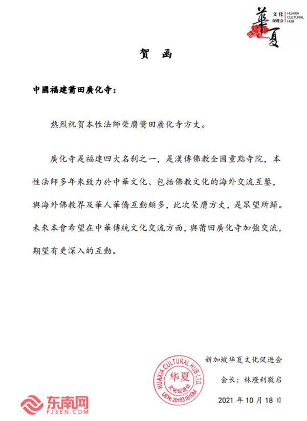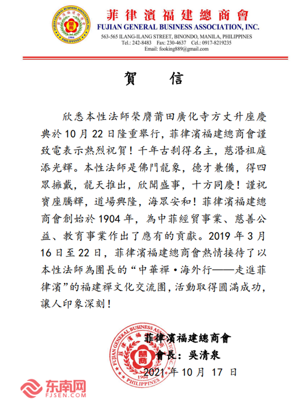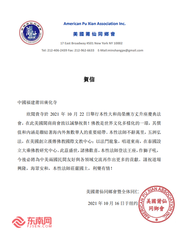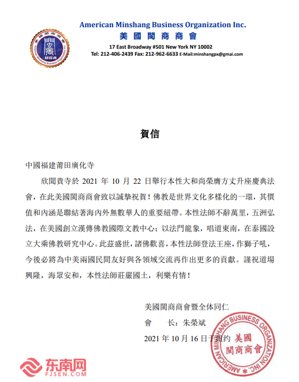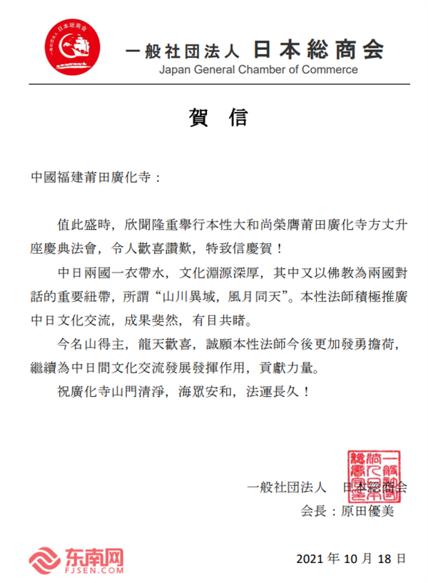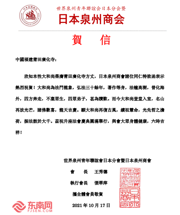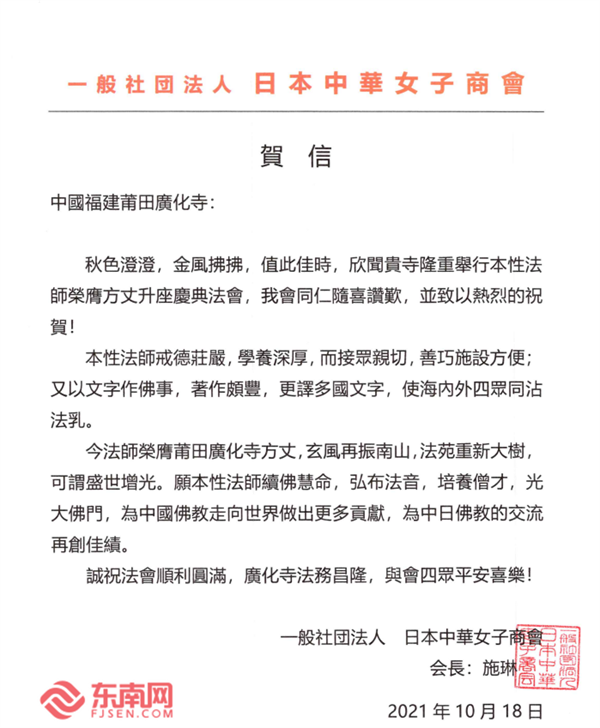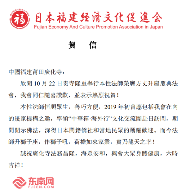 日本福建經(jīng)濟(jì)文化促進(jìn)會賀信