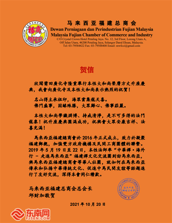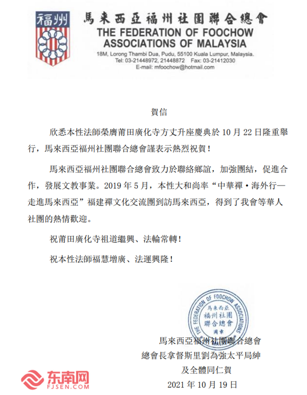 馬來西亞福州社團(tuán)聯(lián)合總會賀信