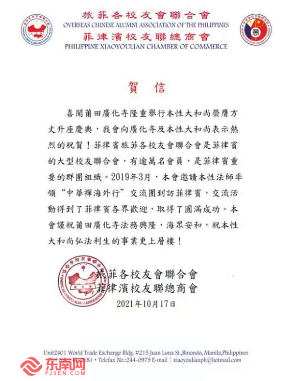 菲律賓旅菲各校友會聯(lián)合會賀信