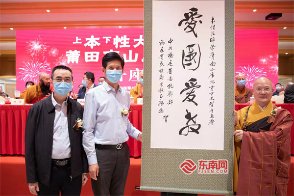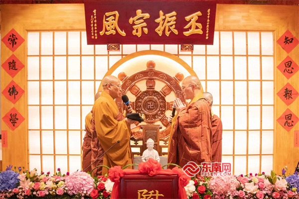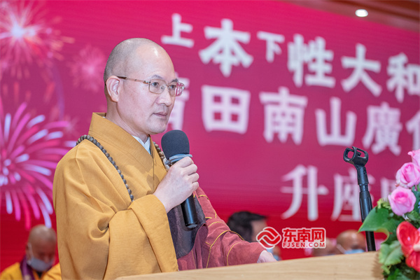 省佛教協(xié)會常務(wù)副會長、莆田南山廣化寺方丈本性法師致感謝辭(攝影:唐林雪) 本性禪師感謝各位黨政領(lǐng)導(dǎo)、長老、信眾們的信任和支持。并表示,擔(dān)任莆田南山廣化寺新任方丈讓他深感責(zé)任重大。“南山廣化寺,是漢傳佛教全國重點寺院,有驕傲的歷史,也有可圈可點的今天?!彼硎荆瑢⑹冀K堅持愛國愛教、守法持戒、尊老護(hù)少、團(tuán)結(jié)六和,致力于推動佛教中國化,維護(hù)世界和平、祖國統(tǒng)一、民族團(tuán)結(jié)、宗教和睦,向海內(nèi)外傳承弘揚中華優(yōu)秀傳統(tǒng)文化,助力中華民族偉大復(fù)興。 據(jù)了解,本性禪師為福建省寧德市人,先后就讀于中國佛學(xué)院南京棲霞山分院、北京中國佛學(xué)院、斯里蘭卡巴利語國際佛教大學(xué)、斯里蘭卡凱拉尼亞大學(xué)研究生院。出版佛學(xué)專著如《中華禪五宗修學(xué)入門》《中華漢傳佛教四大禪法修學(xué)入門》《佛教的基本觀點》《中國禪的跨國與跨界》《佛教與東西方文化》以及禪悟系列等10余部?,F(xiàn)任福建省佛協(xié)常務(wù)副會長、福建佛學(xué)院院長、福建省開元佛教文化研究所所長、莆田南山廣化寺方丈、福州芝山開元寺方丈等。為推動中華優(yōu)秀傳統(tǒng)文化“走出去”,展現(xiàn)中國文化自信,本性禪師攜手東南網(wǎng)海外部共同策劃了“中華禪文化海外行”品牌交流活動,已先后走進(jìn)日本、菲律賓、馬來西亞、泰國等國家,開展座談交流會、主題禪學(xué)講座等內(nèi)容,在海外僑界引起了廣泛關(guān)注和熱烈反響。