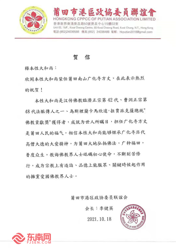 香港莆田政協(xié)委員聯(lián)誼會賀信